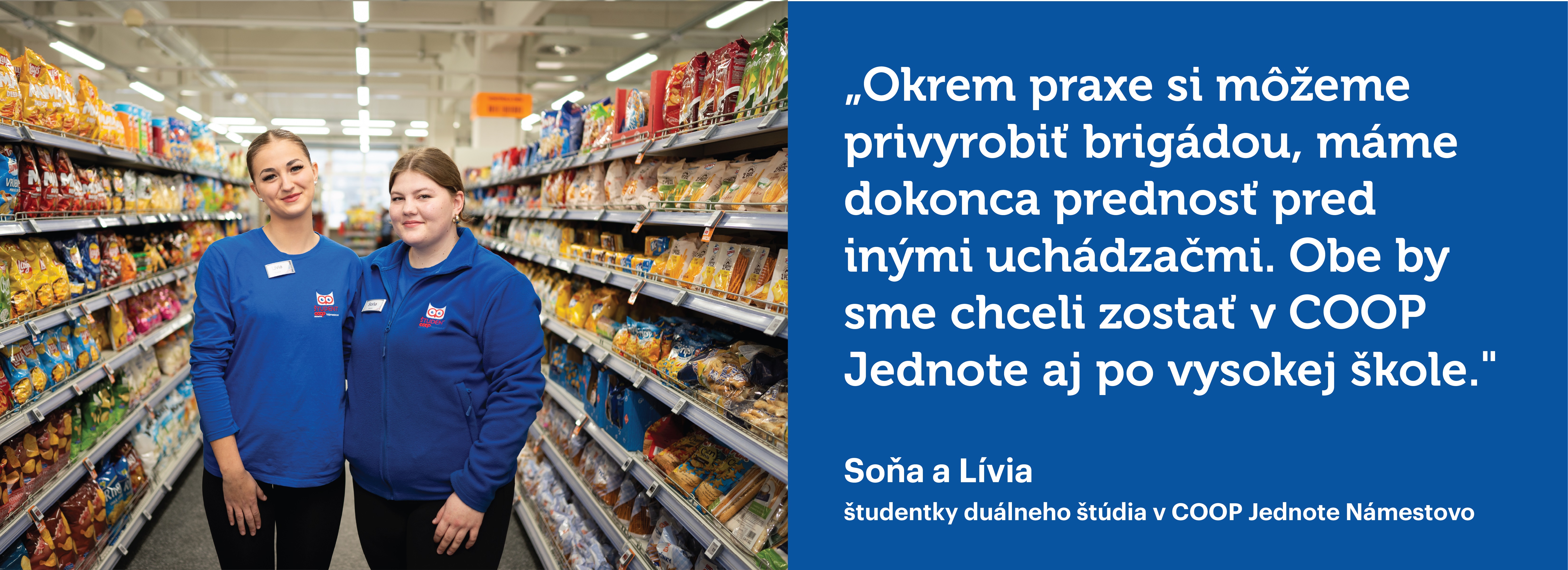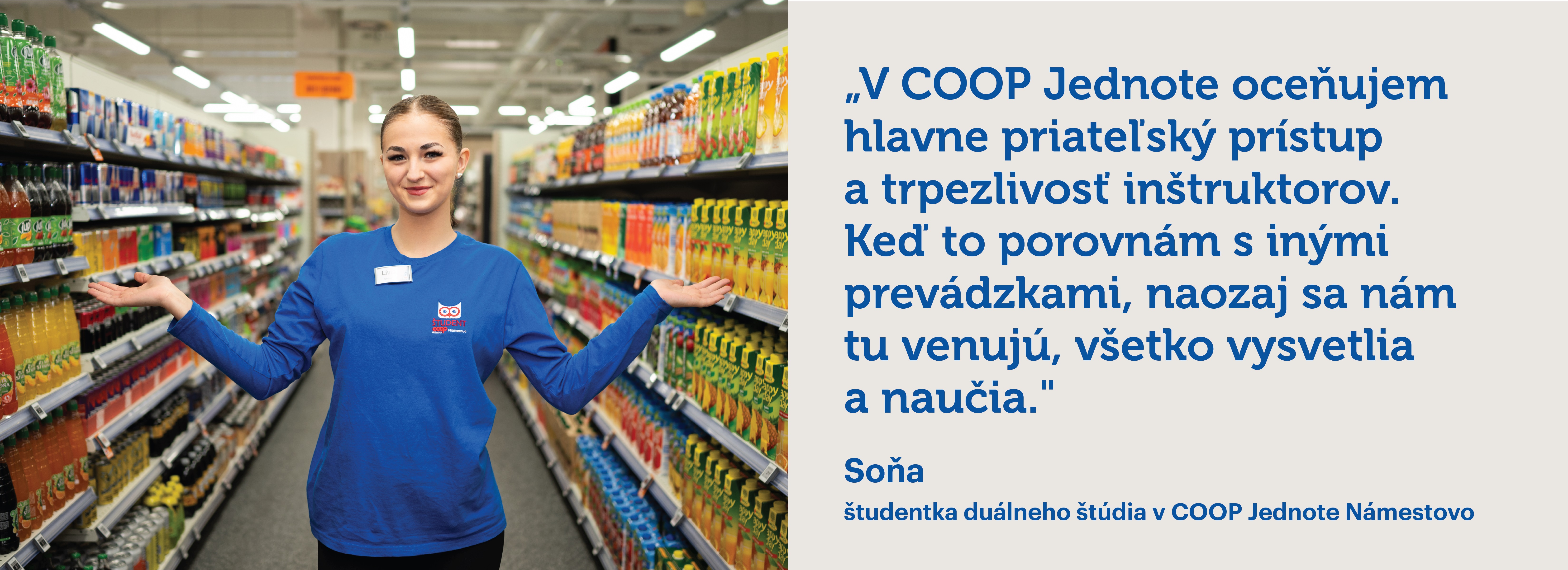Kvalitné vzdelanie, reálna prax a pravidelný príjem už na strednej škole? Presne to ti ponúka duálne vzdelávanie v COOP Jednote. U nás sa od prvého dňa budeš cítiť ako doma. Môžeš sa spoľahnúť na pomoc skúsenejších kolegov, ktorí ti všetko trpezlivo vysvetlia a ukážu.